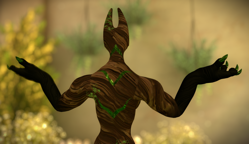 A demonic Forest Creature with wooden skin, moss, and metallic greens. Glowing flowers where the eyes should be